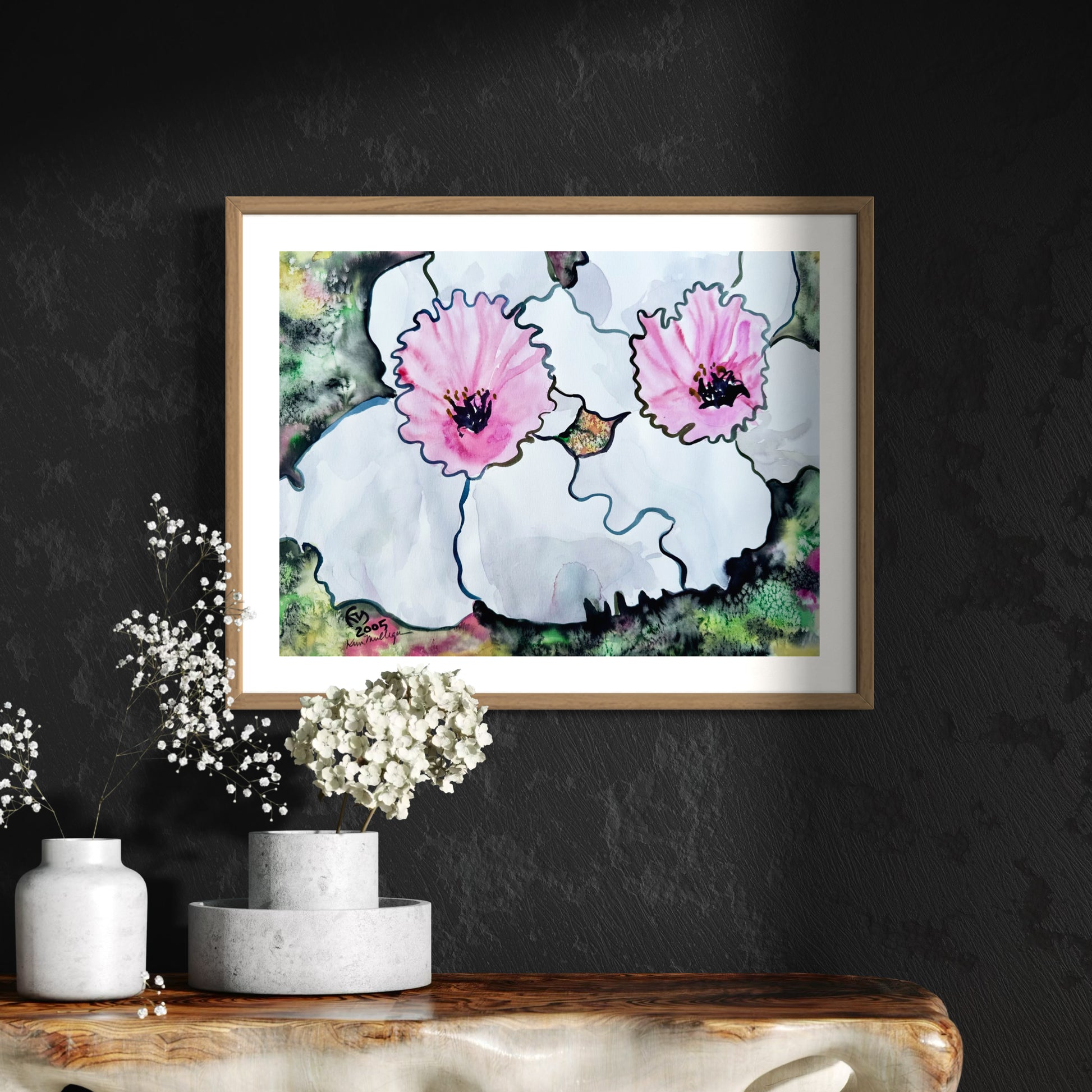 This abstract floral watercolor explores soft pink blooms floating within fluid, organic shapes. Loose lines and washes move freely across the surface, allowing color and negative space to interact in an intuitive, almost dreamlike way. The contrast between delicate petals and darker, textured edges creates a sense of quiet movement and gentle tension.
