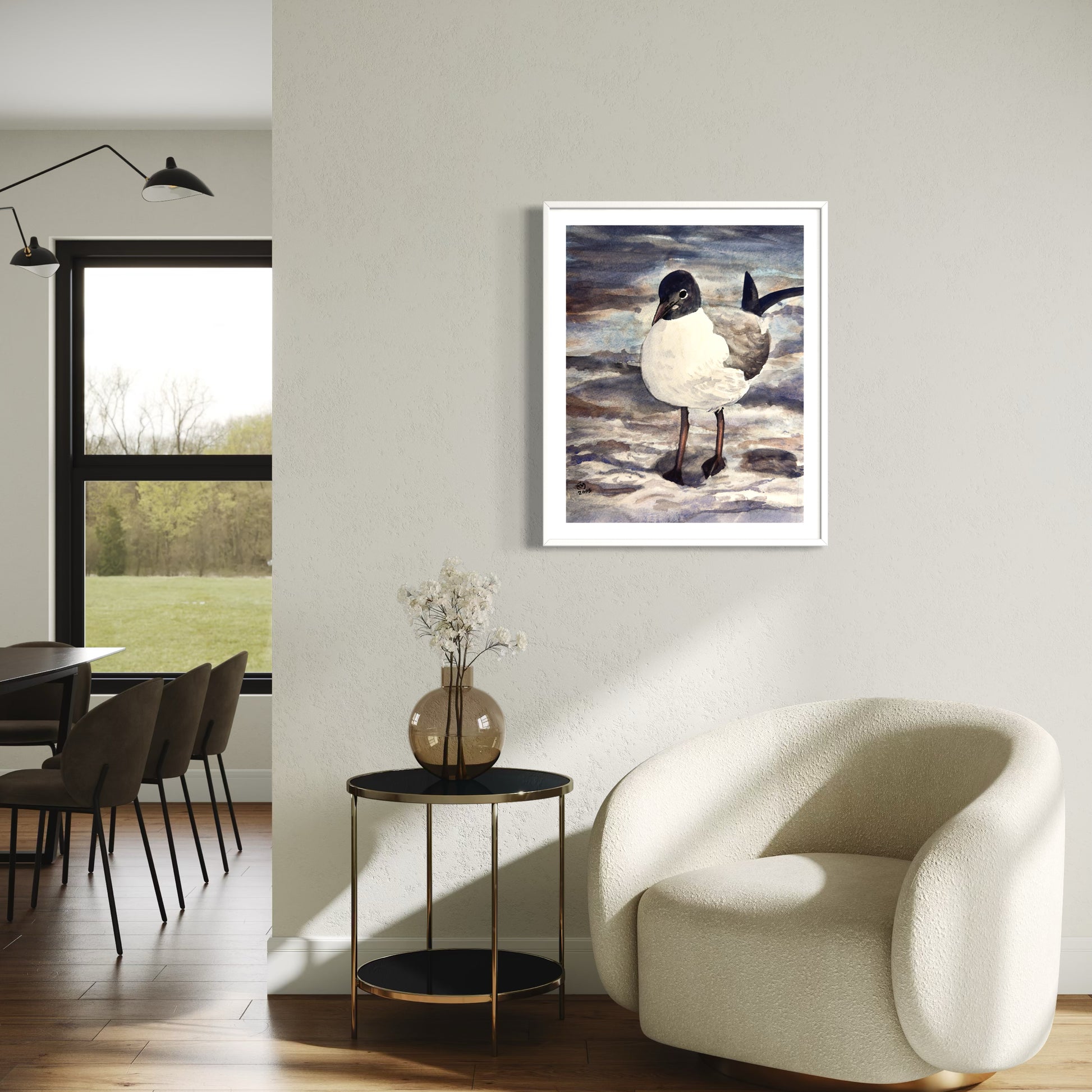 This watercolor print captures the quiet presence of a black-headed gull standing on the beach. Soft washes of gray, blue, and sand tones create a calm coastal atmosphere, while the gull’s simple, direct posture gives the piece a gentle sense of personality and stillness.