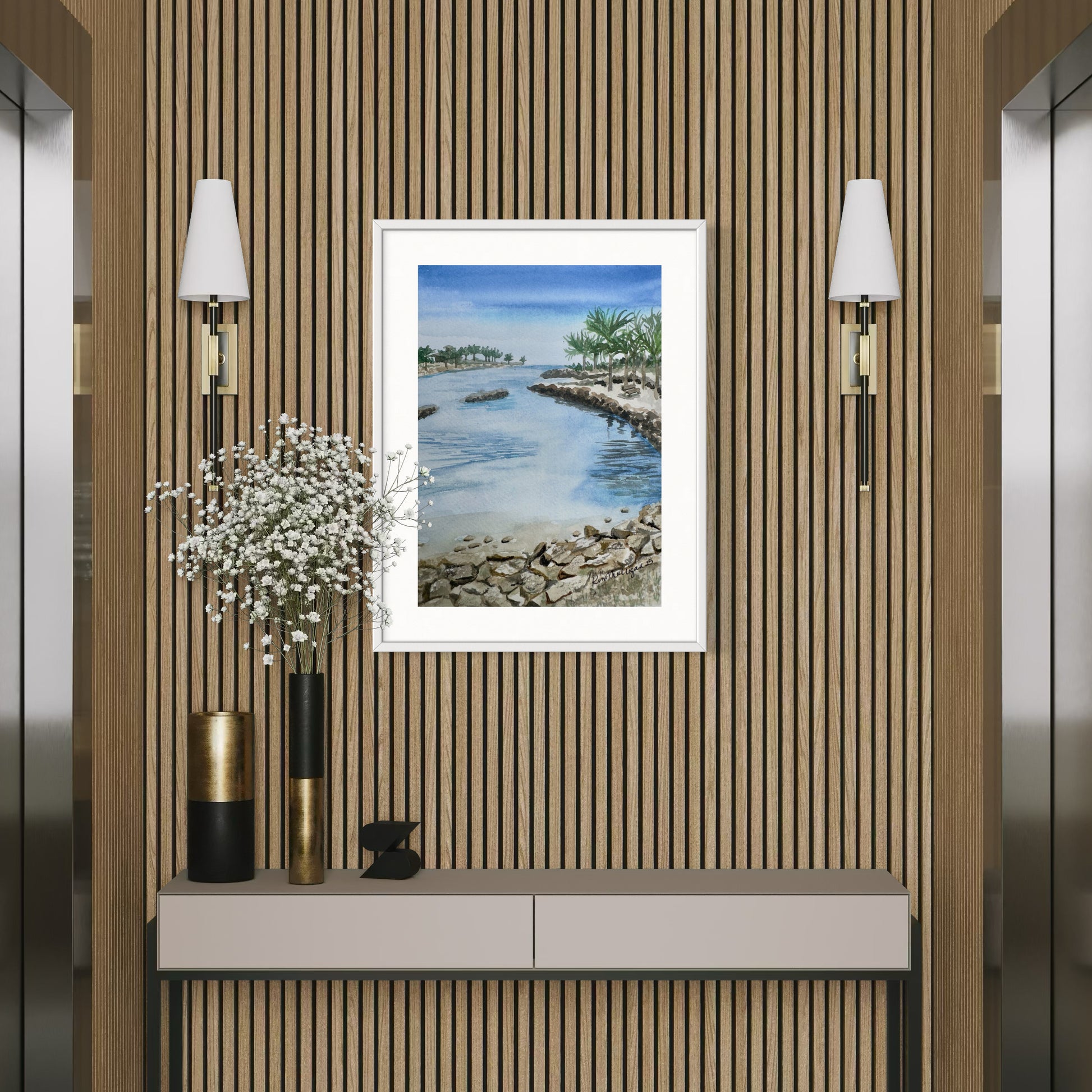 This watercolor was inspired by time spent at Dubois Park, a place I return to again and again for its quiet beauty. I love how the inlet curves gently between the rocks, with palm trees lining the shore and soft reflections moving across the water. It’s one of those peaceful spots —perfect for just sitting, watching the water, and letting your mind wander.