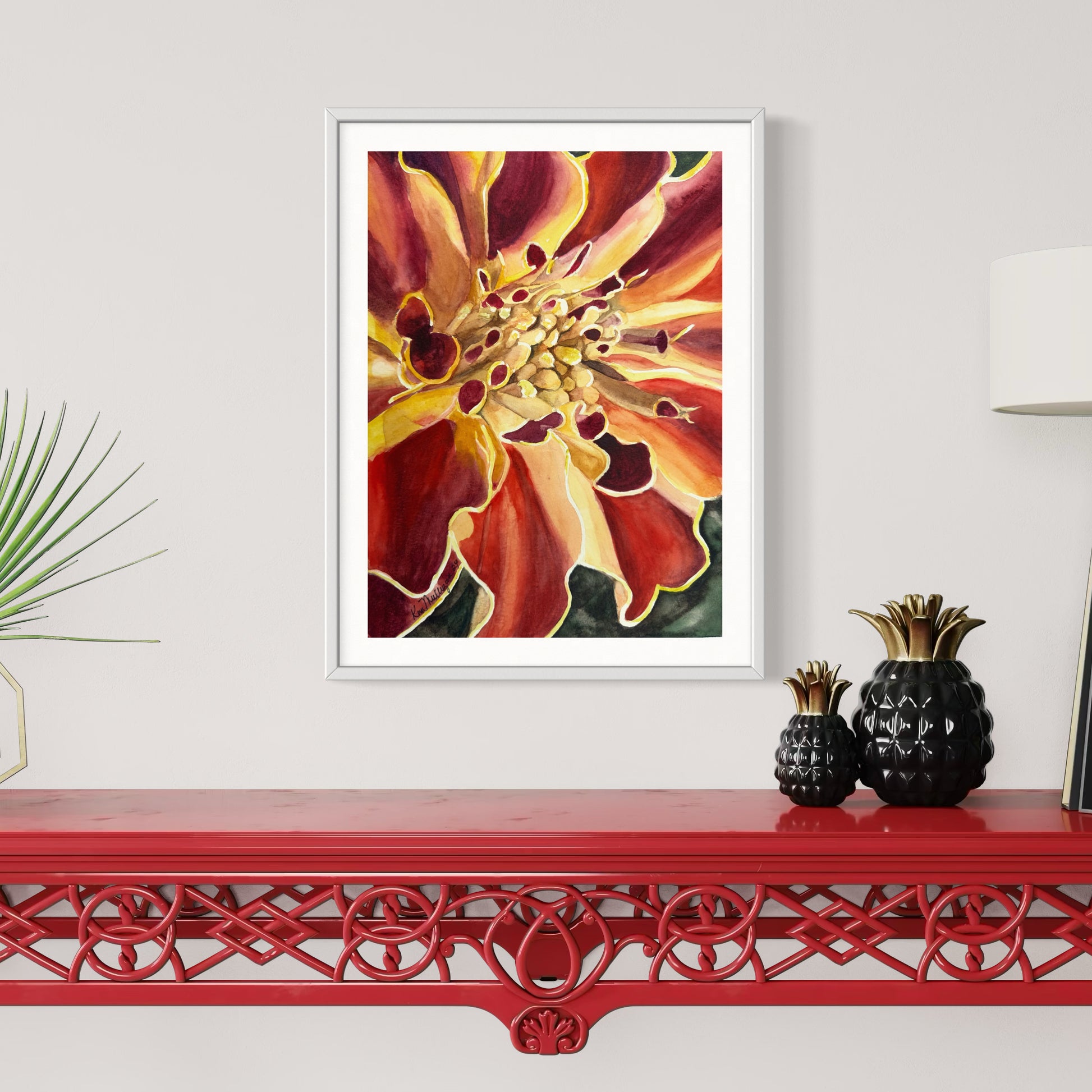 This bold marigold watercolor print bursts with fiery reds, golds, and warm tones, capturing the flower’s intricate beauty and vitality. 🌺 Perfect for adding energy and elegance to your walls, it makes a stunning centerpiece or thoughtful gift for any flower lover.If you would like a larger size contact me for a price quote.