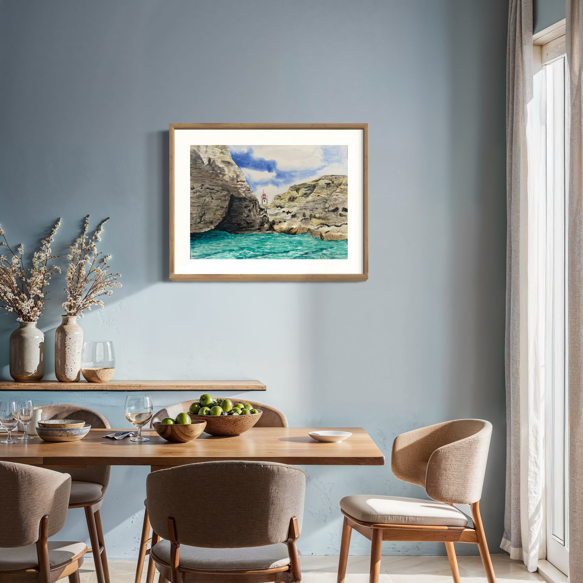 I painted this from memory and photos back at our rental, focusing more on the feeling of being there than on perfect detail. The loose watercolor and bright turquoise colors captured how alive and windswept the scene felt.
