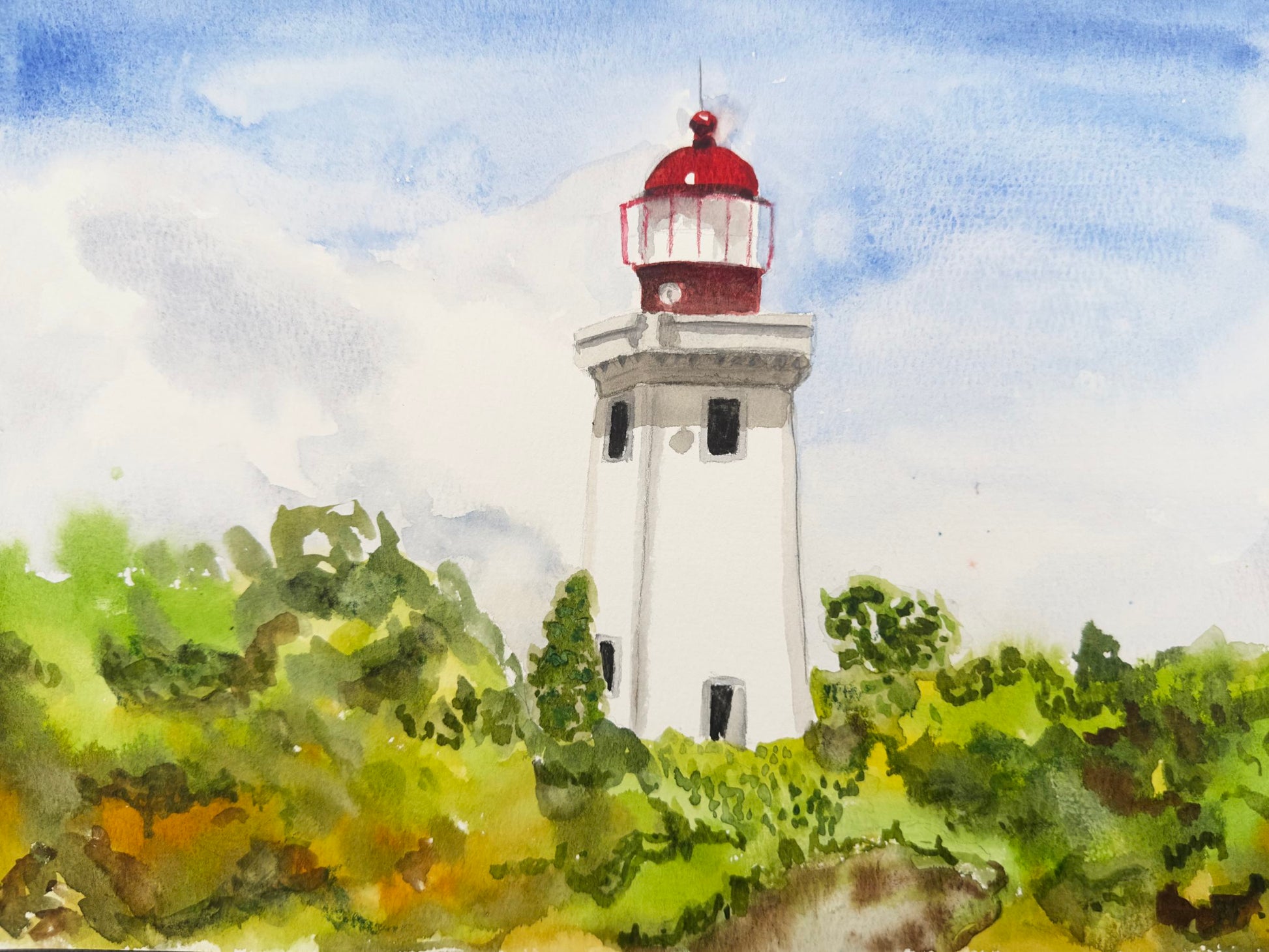 I painted this from memory and photos back at our rental, focusing more on the feeling of being there than on perfect detail. The loose watercolor and fresh greens capture how alive and windswept the scene felt.