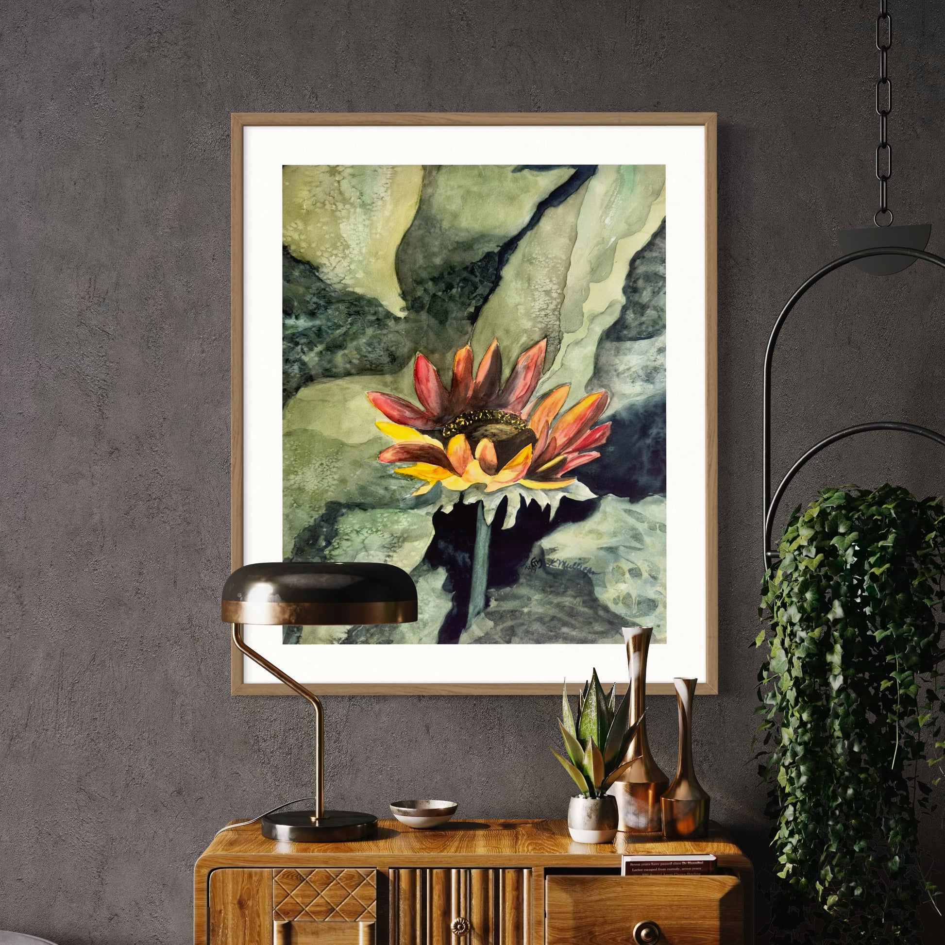 This sunflower emerges from deep, layered washes of green and charcoal, its warm reds, golds, and amber tones glowing against a shadowed background. The painting highlights contrast and depth, allowing the flower to feel both grounded and luminous, as if caught in a quiet moment of transformation.